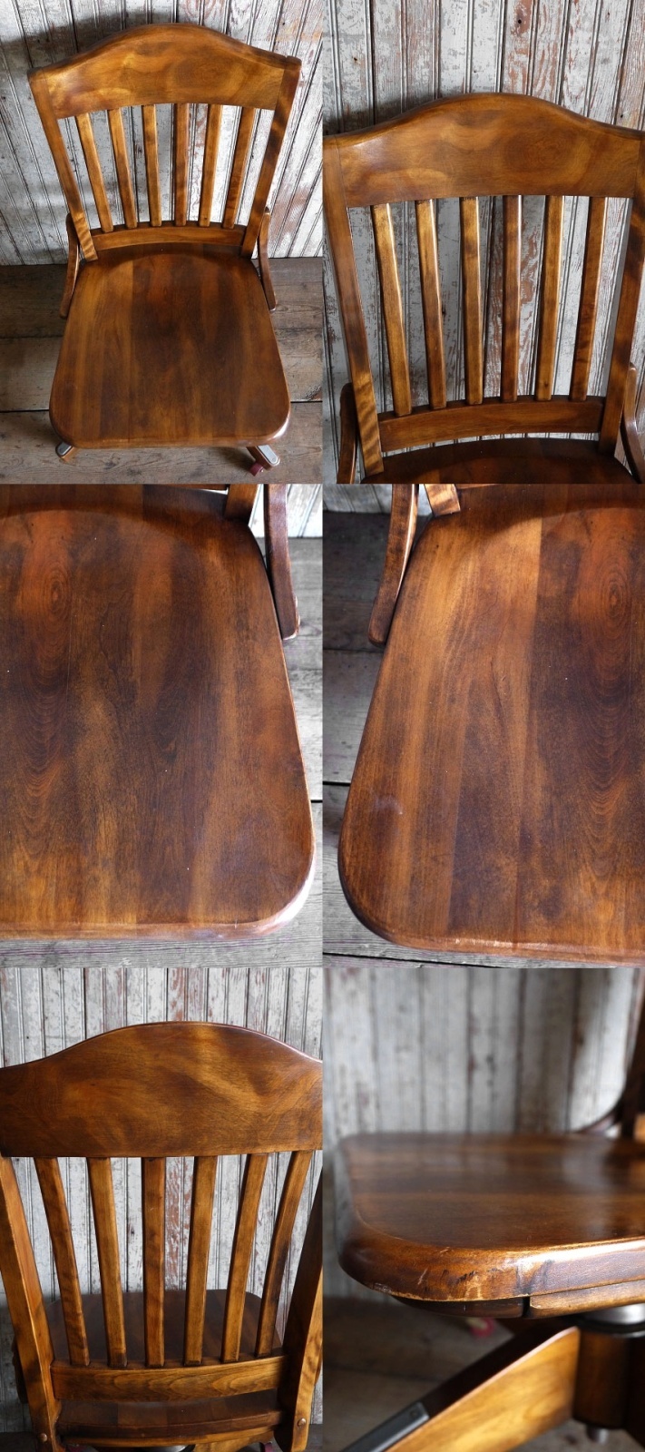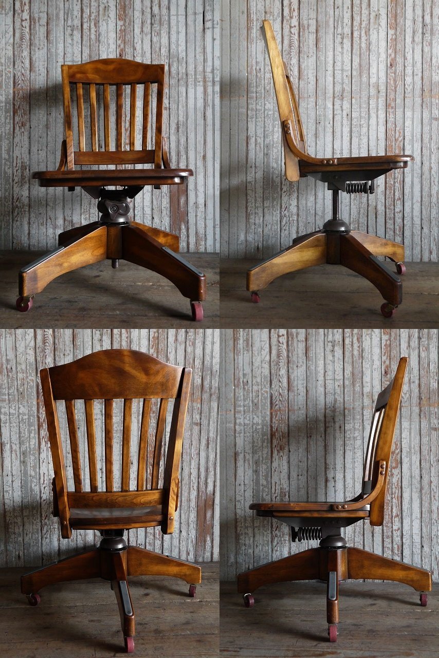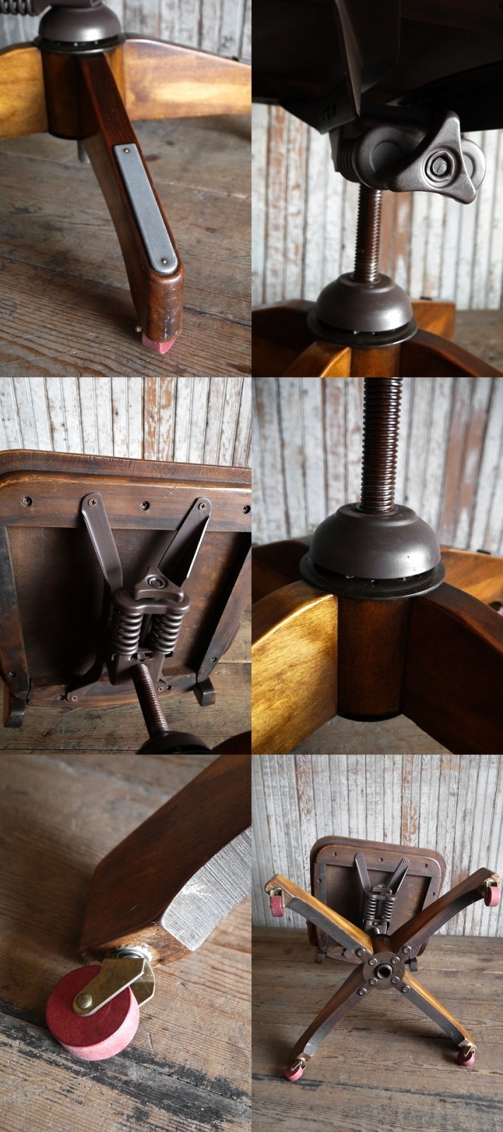 アメリカで買い付けたアンティークのデスクチェアです。均整のとれたフォルムに長い年月を経た上質な木質の風合いが非常に良い雰囲気があります。回転座面のキャスター仕様で座面の高さとロッキング調整が可能です。置いておくだけでも存在感がございますのでインテリアのアクセントにお勧めです。状態ですが、木質劣化、色抜けや塗装の劣化、金属劣化やサビ、小傷や擦れ、角や縁にカケ、汚れ、打痕傷、多少の歪みやガタつき、キャスターの劣化等の使用感はございますが雰囲気を損なうようなダメージはなくアンティークならではの良い状態かと思います。あくまでアンティークになりますのでご理解いただける方のご購入をよろしくお願い致します。