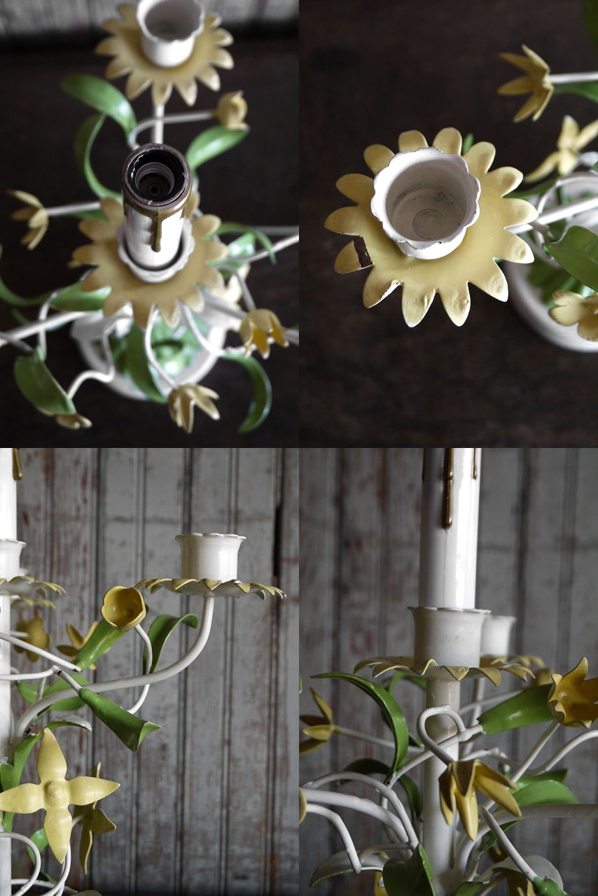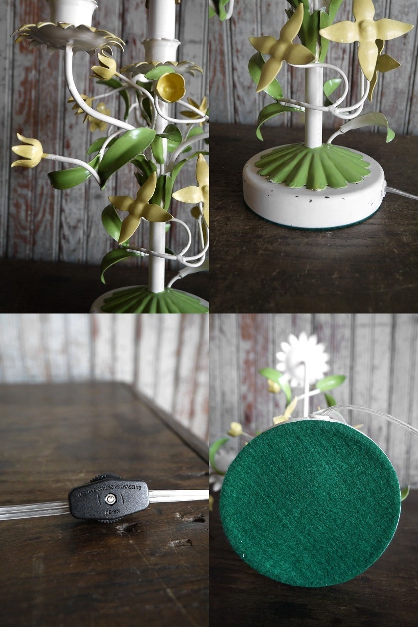 アメリカで買い付けたアンティークのテーブルランプです。キャンドルホルダー付きでリーフ×フラワーデザインが雰囲気良く、消灯時にも存在感がありますのでインテリアのアクセントにお勧めです。通常コンセントで電球は付属しませんが市販のE12mm口径の一般的なタイプですのでご用意ください。コード途中にスイッチがございます。状態ですが、全体的に小傷や擦れ、汚れ、くすみ、色褪せ、塗装剥がれ、金属劣化や錆、多少の歪み等の使用感はございますが雰囲気を損なうようなダメージはなく、アンティークならではの良い状態かと思います。あくまでアンティークになりますのでご理解いただける方のご購入をよろしくお願い致します。