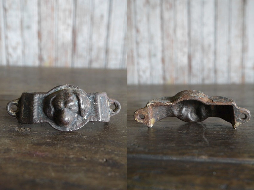アメリカで買い付けたアンティークのハンドルです。ドッグデザインが施されたアイアン製の引き出し用ハンドルで経年による風合いがアンティークならではの趣があります。状態ですが、金属劣化や錆、小傷や擦れ、汚れ、くすみ、色褪せ、塗装剥がれ、多少の歪み等の使用感はございますが雰囲気を損なうようなダメージはなくアンティークならではの良い状態かと思います。あくまでアンティークになりますのでご理解いただける方のご購入をよろしくお願い致します。