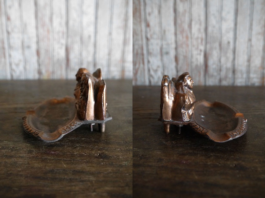 アメリカで買い付けたアンティークのアッシュトレイです。経年によるメタルの風合いとデザインが雰囲気良く、置いておくだけでもお部屋のやショップ等のインテリアのアクセントになりますのでお勧めです。状態ですが、経年による小傷や擦れ、汚れ、くすみ、金属劣化やサビ、多少の歪み等はございますが雰囲気を損なうようなダメージはなくアンティークならではの良い状態かと思います。あくまでアンティーク、観賞用ですのでご理解いただける方のご購入をよろしくお願い致します。