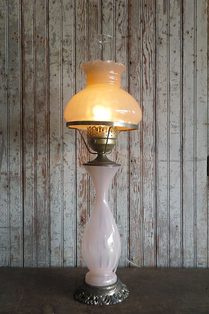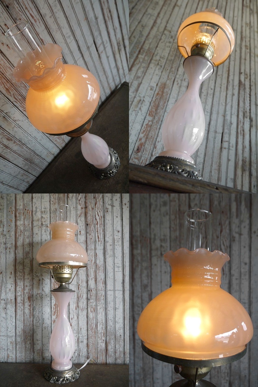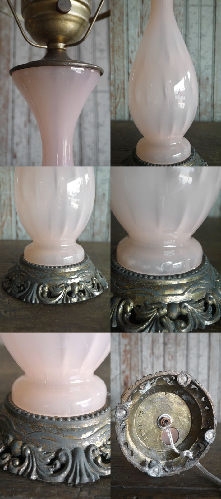 アメリカで買い付けたアンティークのテーブルランプです。ピンクカラーのガラスが魅力でクリアガラスシェードも付いており、灯りをともすと雰囲気良く空間を演出致します。消灯時にもインテリアのアクセントになりますのでお勧めです。通常コンセント式で電球は付属いたしませんが市販にも販売しているE26mm口径の一般的なタイプですのでご用意ください。スイッチ付きのソケットになります。状態ですが、小傷や擦れ、汚れ、くすみ、塗装剥がれ、金属劣化や錆、ガラス生産工程上にできた気泡や縁や角にカケ、全体的に歪み、がたつき等の使用感はございますが雰囲気を損なうようなダメージはなく、アンティークならではの状態かと思います。あくまでアンティークになりますのでご理解いただける方のご購入をよろしくお願い致します。